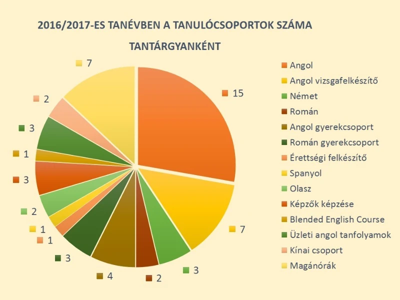 Központunkban a 2016-2017-os tanév során összesen 54, többségében nyelvi készségek fejlesztését célzó tanfolyamot szerveztünk. 20 csoport tanult velünk angolul, 3 csoport németül, 2 csoport románul, 2 csoport kínaiul, 2 olaszul, 1 spanyolul. További hat csoportban 15 év alatti gyerekek tanultak angolt és románt.